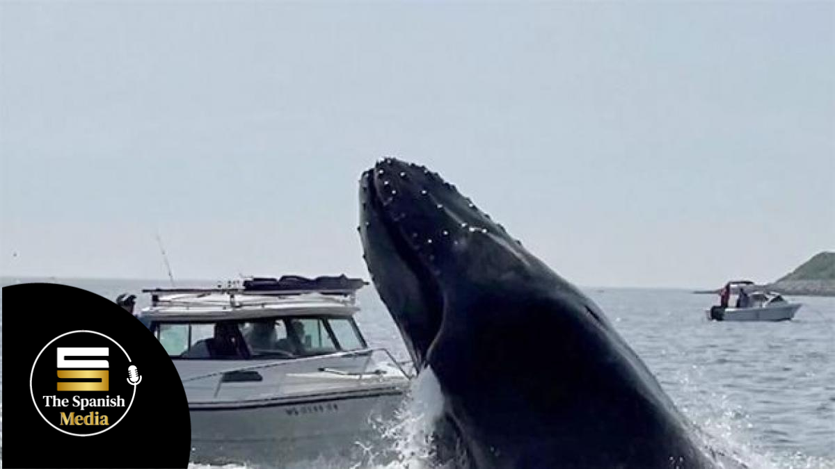 Durante este domingo, un video registró el momento en que una ballena jorobada sale del agua y salta sobre una pequeña embarcación en el estado de Massachusetts, en Estados Unidos.