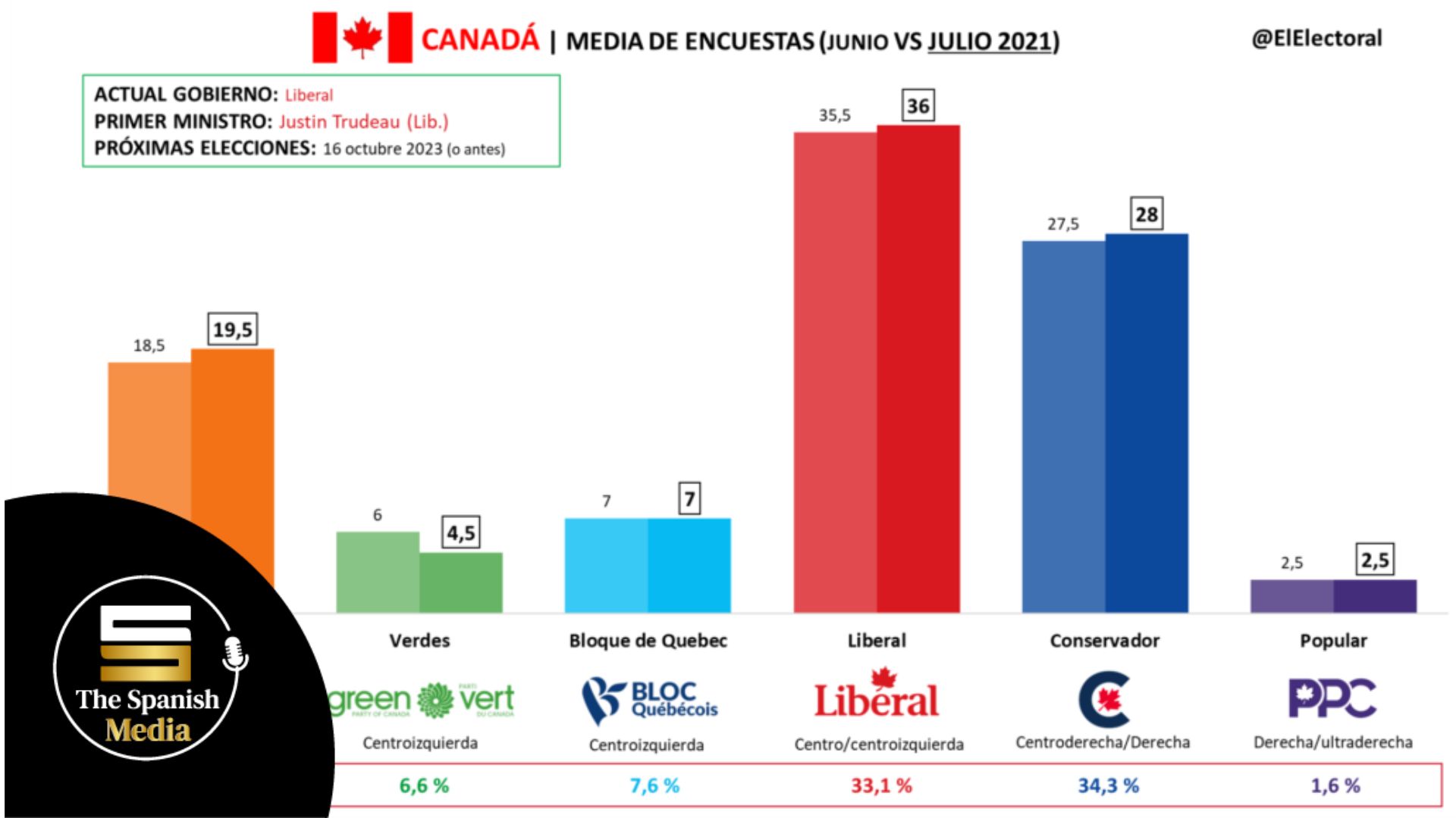 Diversos estudios mostraban un cierto estancamiento entre los partidos desde el 2019, sin embargo, estos números muestran un quiebre y registran un crecimiento de cuatro puntos por parte de los conservadores, contra un punto perdido por los liberales desde la última encuesta realizada por el instituto, hace cuatro meses.