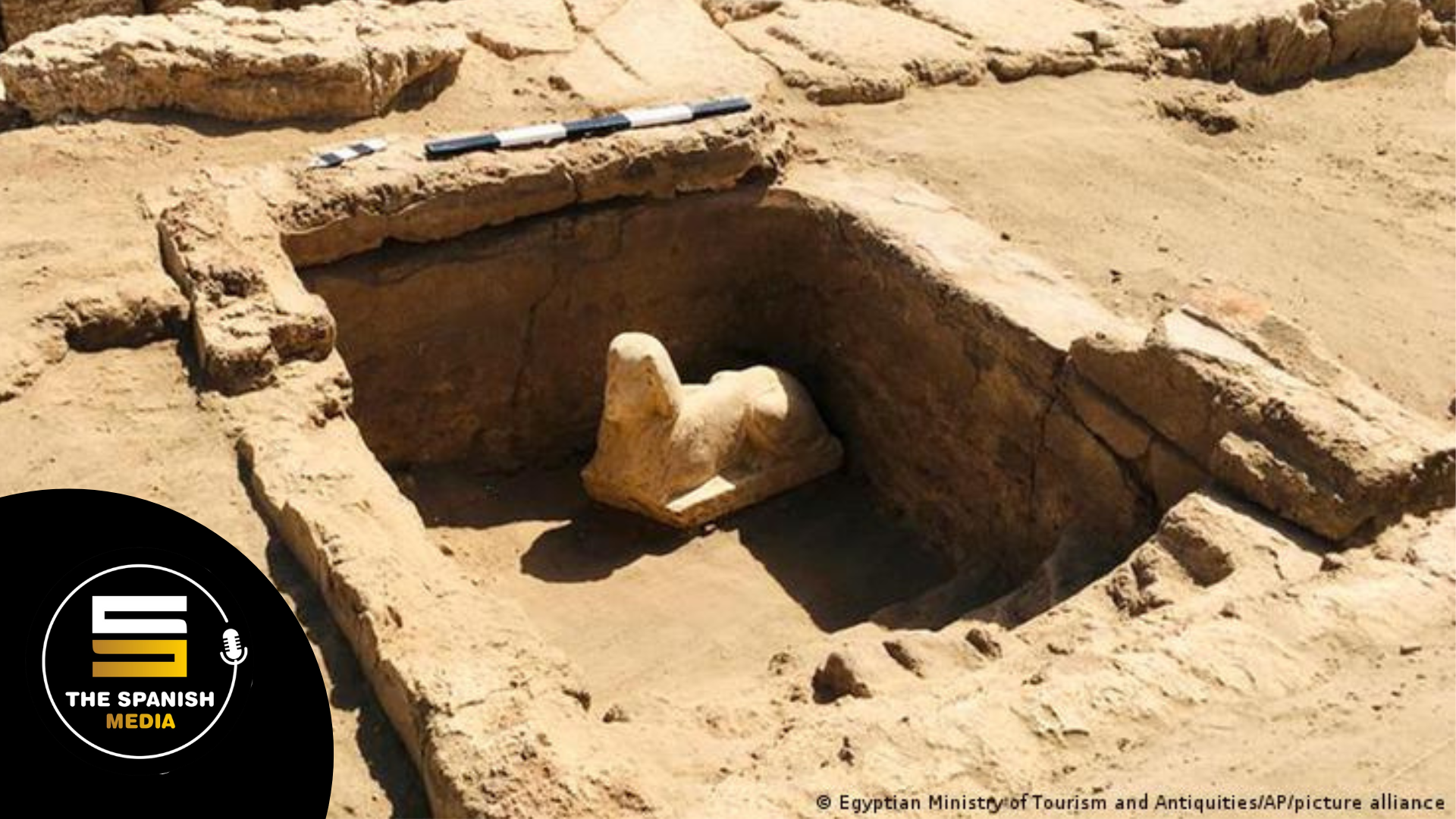 Su aparición fue mientras los arqueólogos limpiaban el campo de excavación. Allí encontraron a la Esfinge de piedra caliza. El experto explicó que la cabeza de la esfinge, está prácticamente intacta, la cual lleva un tocado funerario conocido como Nemes, con una cobra sobre la frente, típico atuendo de los faraones egipcios cuando eran representados como reyes después de su muerte. Lo curioso de la estatua es que tiene una ligera sonrisa en los labios y hoyuelos en los costados.